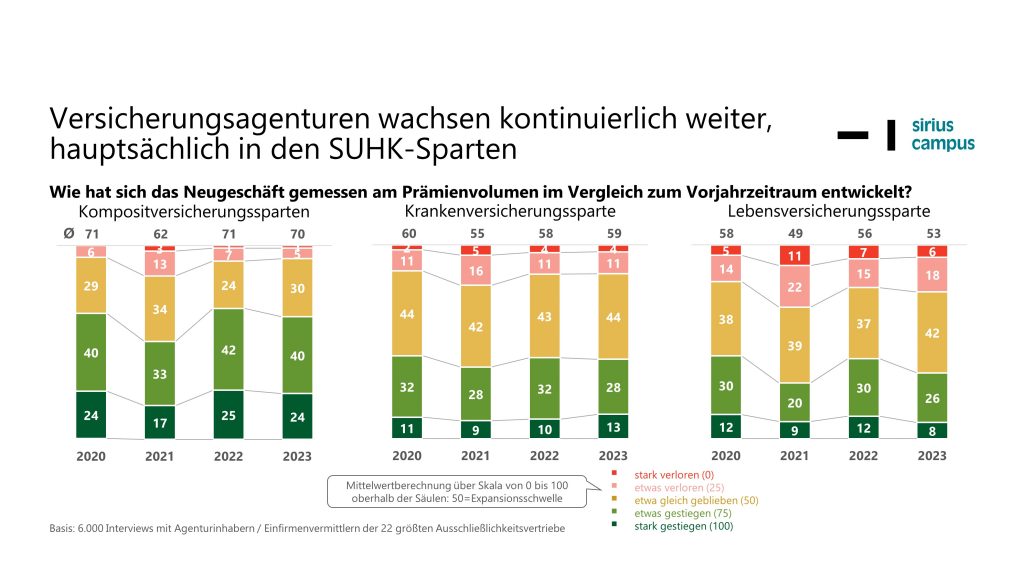 April 2024. Seit 2020 berichten rund zwei Drittel aller Versicherungsagenturen im Ausschließlichkeitsvertrieb von etwas oder stark steigenden Prämienvolumen im SUHK-Neugeschäft. Nur in 2021 kam es aufgrund der Pandemie zu einem Dämpfer mit einem Wachstumsindex von immerhin noch 62. Bereits in 2022 erreichte der SUHK-Wachstumsindex wieder seinen Normalstand von 71. Dagegen liegt der Wachstumsindex für Krankenversicherungen mit 59 nur knapp über der Expansionsschwelle von 50. In der Lebensversicherung fällt das Neugeschäft mit einem Wachstumsindex von 58 in 2020 auf nunmehr 53, praktisch auf Stagnationsniveau. Auch der GDV berichtet in seinen Statistiken von einer jährlichen Zunahme der Vertragsstückzahlen über alle Vertriebswege von 2,5 Prozent in den SUHK- und 2,8 Prozent in den Krankenversicherungssparten. Auch wenn im Jahr 2003 noch drei Viertel aller Versicherungsabschlüsse über Einfirmenvermittler erfolgten, ist die Bedeutung der Agenturen mit knapp der Hälfte aller Versicherungsabschlüsse seit 2019 konstant hoch.