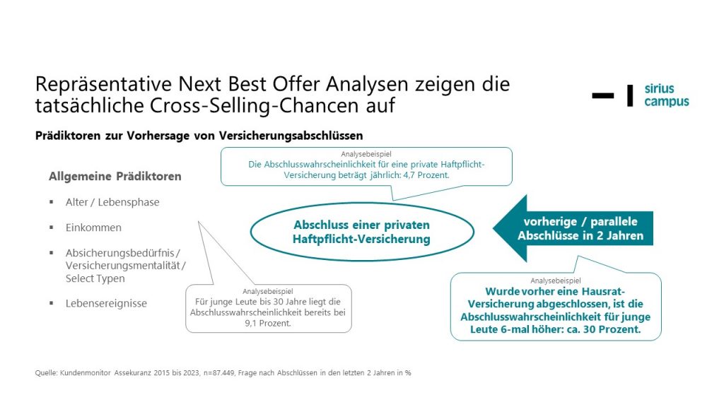 Mit der Untersuchung „Next Best Offer im Versicherungsmarkt“ bietet Sirius Campus eine repräsentative Analyse des nächsten Versicherungsabschlusses (insgesamt sowie differenziert nach Alter und Hauptberatungsort). Die Analysen wurden aus dem Kundenmonitor Assekuranz auf Basis von über 80.000 Interviews entwickelt.